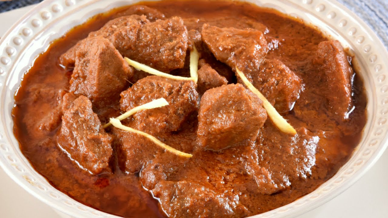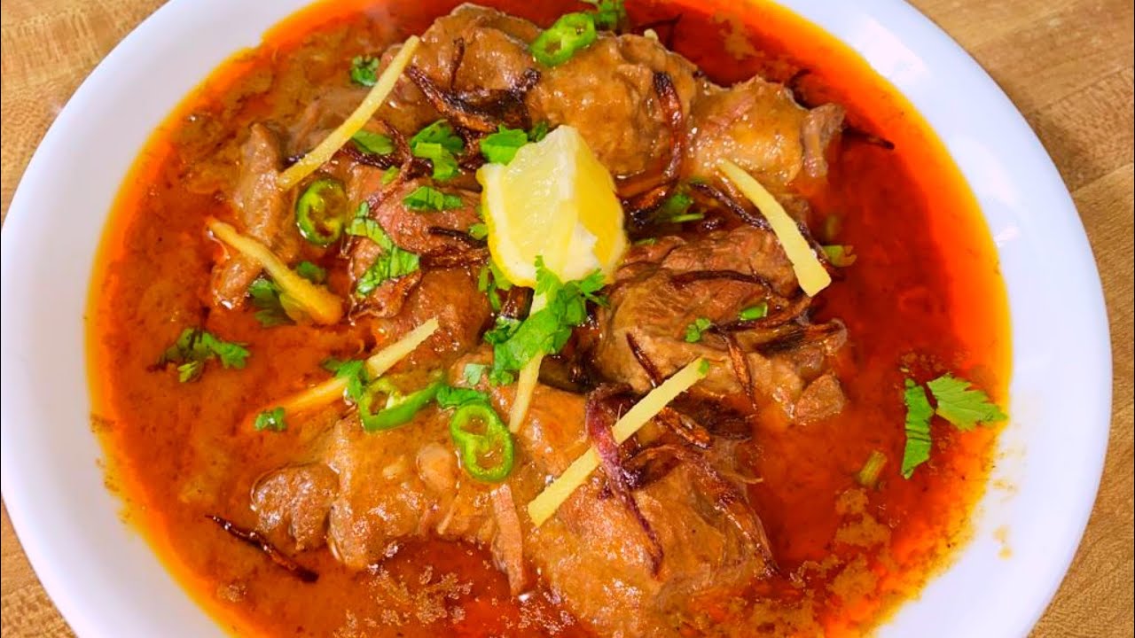 Slow-cooked beef nihari served with fresh ginger and lemon.