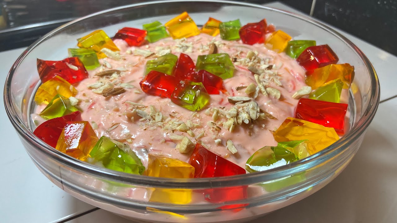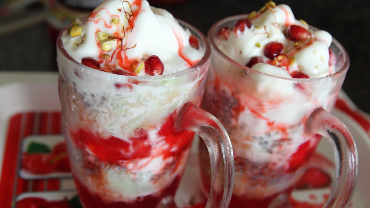Refreshing falooda with ice cream, basil seeds and jelly.