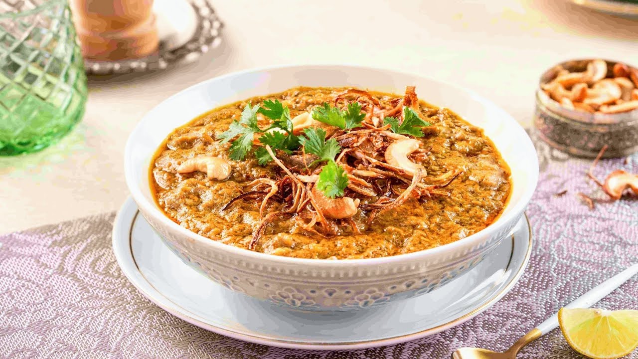 Slow-cooked beef nihari served with fresh ginger and lemon.